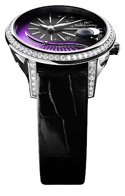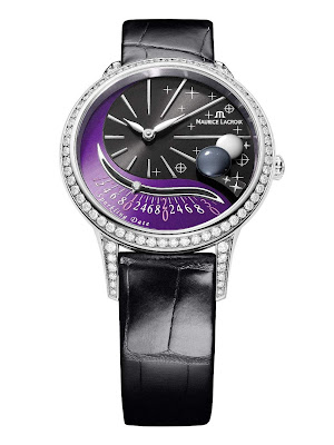 Das Datum wandert und schwankt mit Unbehagen auf dem violetten Hintergrund des Zifferblatts. Der retrograde Kalender erzeugt eine leuchtende Rille, begleitet von einer Hand mit einem einzelnen Diamanteinsatz. Diese Hand folgt einer welligen und liebenswürdigen Kurve, die die Zeit in eine exquisite Kreuzung verwandelt, und dann in der flüchtigen Zeit eines blendenden Blitzes immer wieder ihren Weg zum Ende ihres Kurses wiederaufnimmt - eine erstaunliche retrograde Anzeige, die diesem Lied seine eigene Lyrik hinzufügt Komplikation.